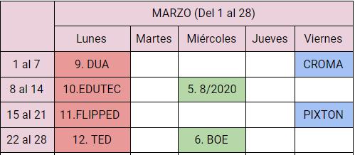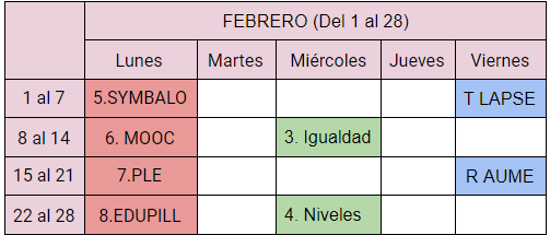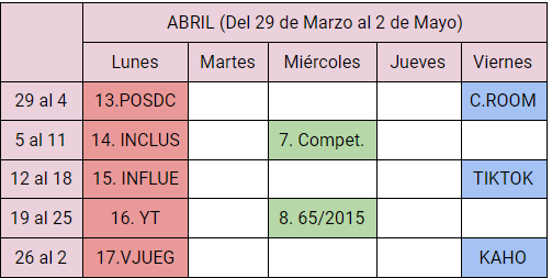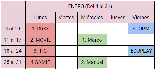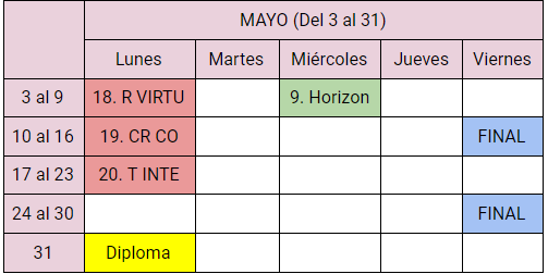 Aquí tenéis la organización del cuatrimestre. Los lunes tendremos TEMARIO, los miércoles REGLAMENTO y los viernes los dedicaremos a las PISTAS para la investigación.